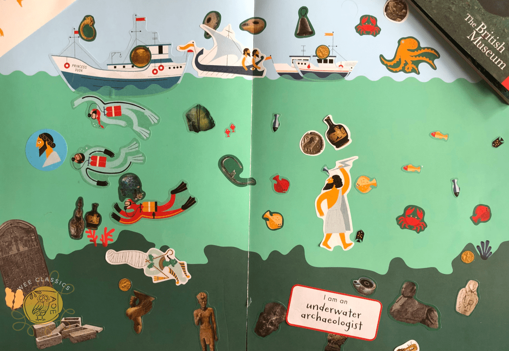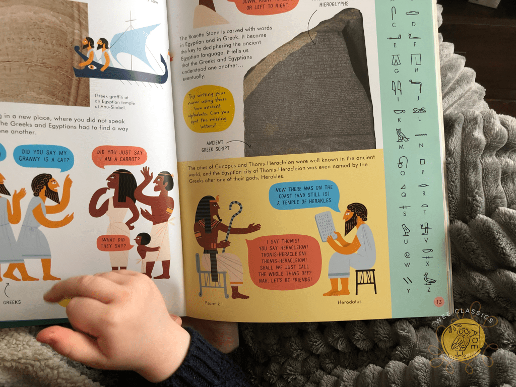 One of my absolute favourite things about these BM/Nosy Crow books is that they combine illustrations with actual photographs of the museum artefacts, bringing the objects very much back to life – and very much capturing H’s imagination in this case as underwater treasure! A lot of the focus is on the relationships between the Ancient Egyptians and Ancient Greeks, and I was pretty happy to see ol’ Herodotus making a guest appearance: