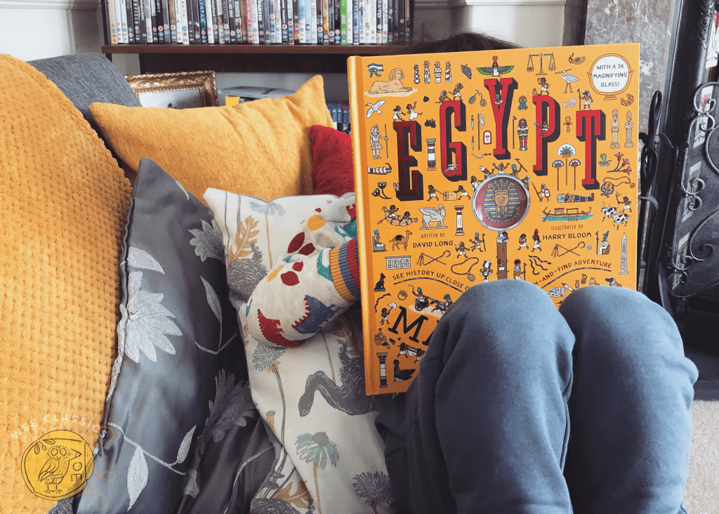 Back to Ancient Egypt we go, with the perfect book for inquisitive little investigators – Egypt Magnified by David Long and Harry Bloom. Another impressive hardback! Brightly coloured and bursting with detail, this search-and-find adventure book comes complete with its very own magnifying glass to help uncover all the smallest features hiding in each scene. And there is plenty to find! H loves any sort of ‘finding’ game, and had been learning how to use a magnifying glass at nursery, so when I spied this in Blackwells I knew we’d have to try it out. It has kept us busy!