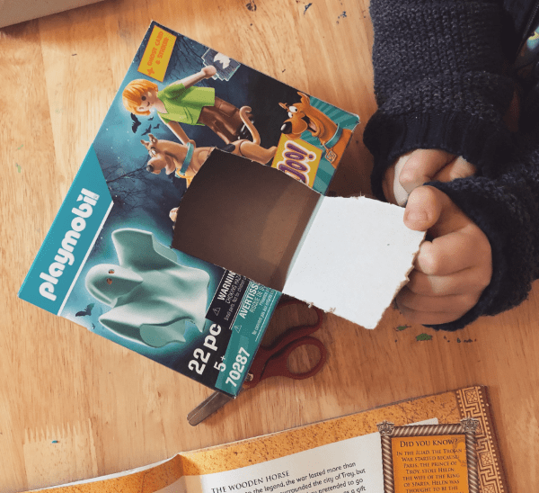 After our success at making a miniature paper Trojan Horse model a few weeks ago, we thought it was time for something a little more challenging. I really want to try out papier-mâché Greek vases, but H insisted we stick with what we know – so we raided the recycling, adapted a few instructions from the fantastic Hands on History: Ancient Greeks by Joe Fullman, and made an EVEN BIGGER Trojan Horse.
