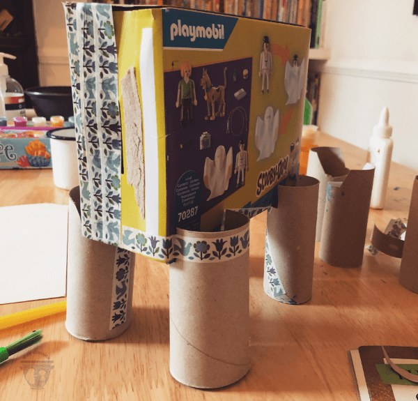 Place the box on top of the four tubes – it should slot nicely into the spaces you cut out in Step 3. Once you have it all lined up, it is time to attach the four legs to the box: we went a little overboard with tape for extra sturdiness, but gluing them on is fine too!
