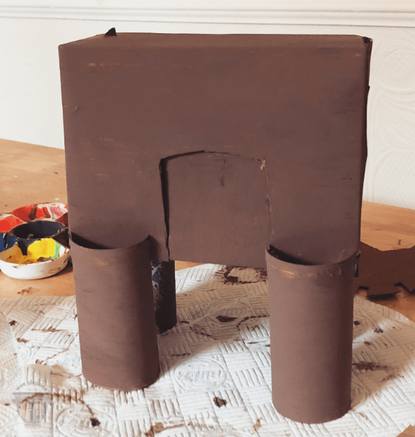 Time to paint! We mixed half brown paint and half PVA glue together to help the colour stick better to the box we used as it was quite glossy. Don’t forget to paint the head you cut out in Step 5, too – then leave it all to dry!