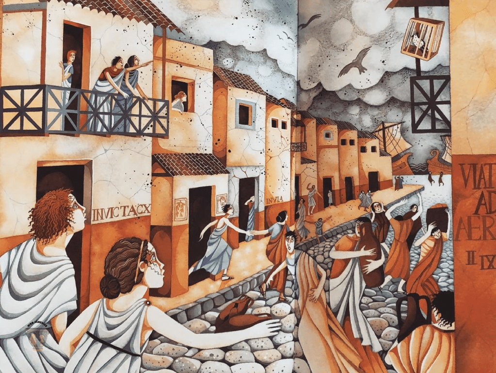 Back to our current story: we join Tranio and Livia on a hot August day, when suddenly the ground starts to shake, birds fly in the wrong direction, and huge thick clouds of ash start to descend on the city. Initially the people aren’t worried, but soon enough panic sets in.