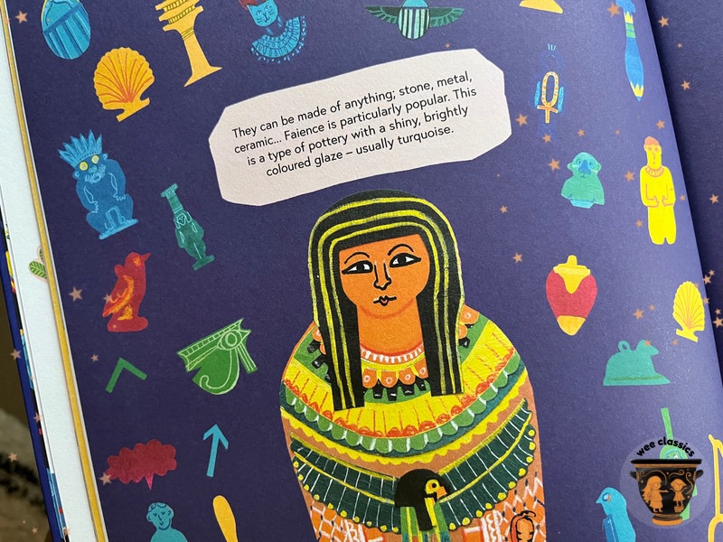 As well as taking you on a tour of the afterlife – the rituals, inhabitants and environments! – it also packs in plenty of information about everyday objects and materials – like this super clear and beautifully illustrated note on faience: