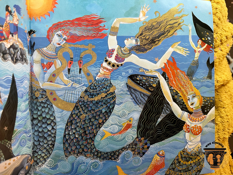 The little island is home to a man called Evenor, his wife Leucippe, and their daughter Cleito. We are told they have very little but they enjoy a happy life – which puzzles Poseidon. How could they be so happy when they have nearly nothing? Poseidon spends so much time watching them to try and work out the answer that he falls in love with Cleito, and the two are married. Everyone rejoices and Poseidon decides to rebuild the little island so it is fit for a divine King and his Queen. The illustrations are so vibrant for the marriage celebrations: just look at the beautifully captured movement and songs of the mermaids and sea creatures —