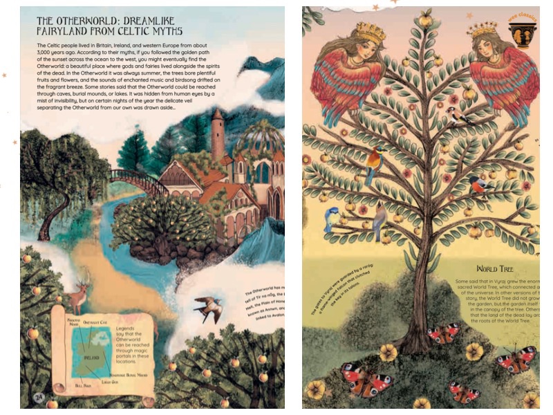 The book takes children on a tour through different afterlife beliefs across the globe, but it isn’t excessively gloomy or morbid – often the bright and engaging illustrations balance out the tone. Each belief is summarised on a double-page spread, with small short paragraphs of text as well as little notes that accompany the images — the 6yo was happy taking turns reading these! It covers the usual popular suspects: we go down to Hades, the Ancient Greek underworld, and encounter Cerberus the guard-dog and Charon the ferryman; we glimpse the Ancient Egyptian Duat and find out about the weighing of the heart. But there’s a wide world of underworlds beyond these! The global range is the most impressive thing about this book, and we loved exploring new and lesser-known locations from Mictlan (Aztec), to Lua-O-Milu (Hawaii) and Adlivun (Inuit). But it doesn’t stop there! There’s also a blend of world religions, including Jacob’s Ladder (Christianity), Jannah (Islam), and the Buddhist underworld.