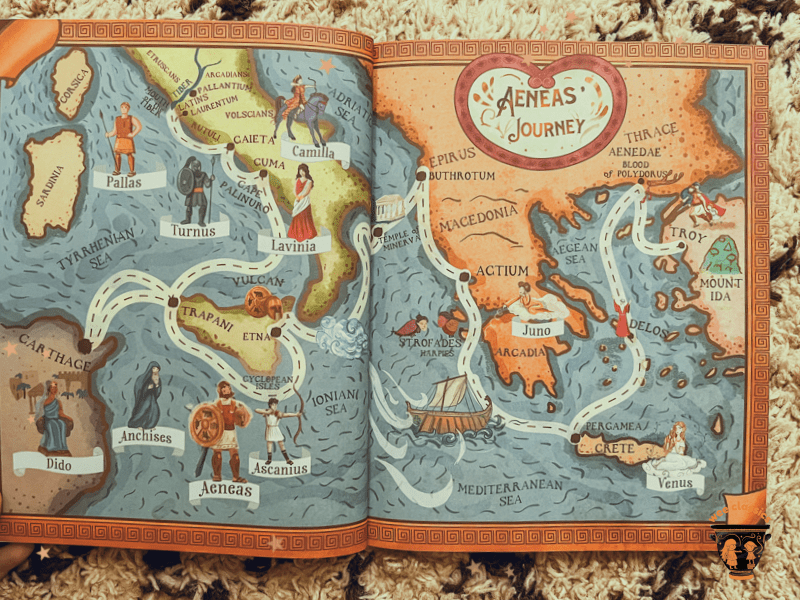 On the resources side, there’s a superb map of Aeneas’ travels at the beginning. This shows his different destinations, and is really useful to refer back to while reading each section: