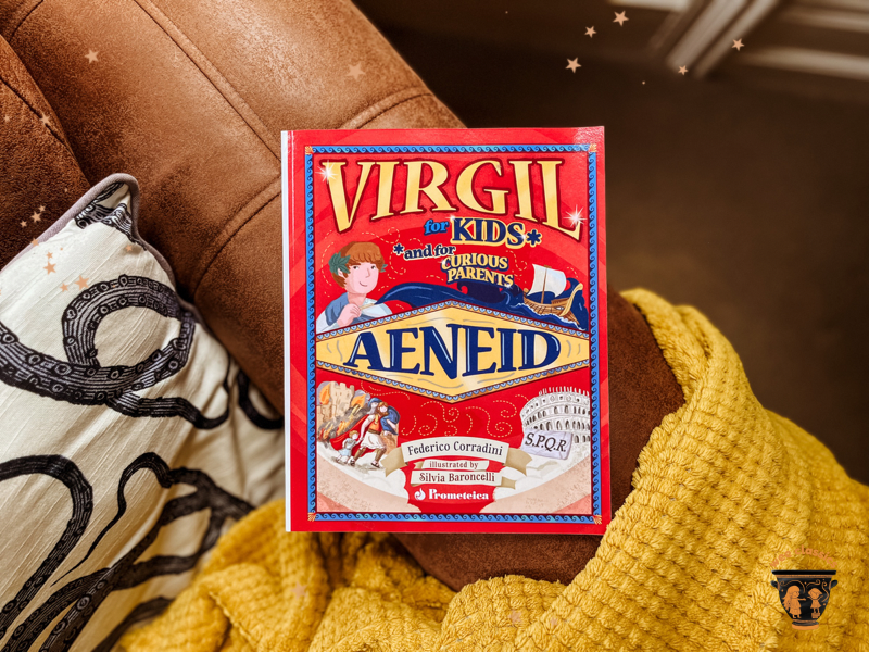 Everyone loves Odysseus and his epic journey home from Troy via witches, ghosts, monsters, storms, and angry gods. But what about the other heroes fighting in the Trojan War – especially on the opposing side!? There’s an intriguing imbalance when it comes to kids versions of Homeric epic (Greek) and the later epic of Virgil, a Roman (Latin) poem telling the story of the Trojan hero Aeneas as he flees his burning city and seeks a new home. There’s endless retellings of Odysseus’s adventures, but much less to be found for younger ages when it comes to Aeneas. Okay, so, he might not be as feisty and fun a hero as Odysseus (sorry Latinists), but there’s still plenty of mischief and mayhem to discover. Plus, there’s much more interesting – and increasingly important – conversations to be had about refugees and displacement, as Aeneas is forced to flee his war-ravaged and doomed city. So when I spotted Virgil’s Aeneid for Kids by Federico Corradini and Silvia Baroncelli, I knew we’d have to investigate!