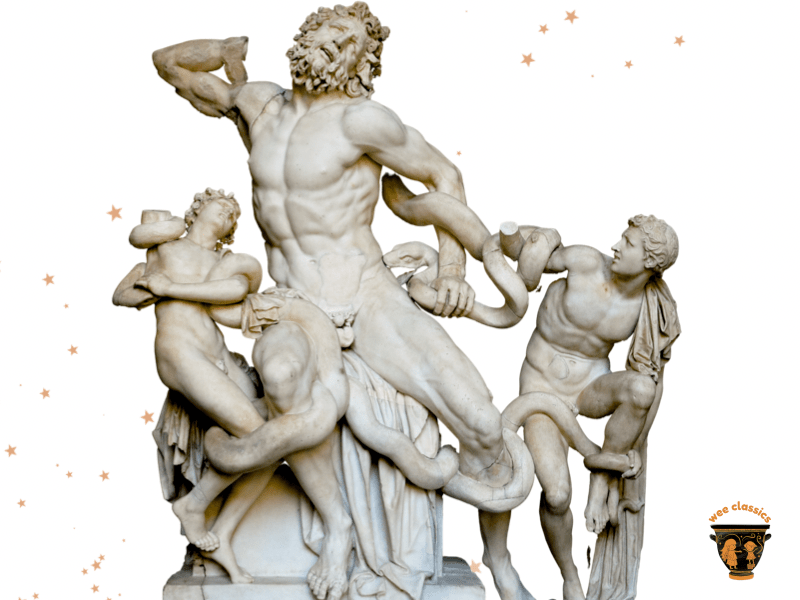 Each of the twenty-five story chunks has one specific illustration to go along with it, based on a key part of the story. These are always brightly coloured on the page before the story starts and always very engaging – they sometimes also mirror famous pieces of ancient art, like the picture of Laocoön and his sons meeting their terrible fate: