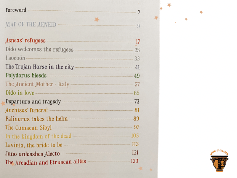 This hefty paperback takes on the challenge of retelling the whole story – all twelve books of Virgil’s original poem – in an accessible and child-friendly way. It does this by breaking down the narrative into the key components, choosing to tell twenty five shorter stories about the characters and events. I liked this approach a lot!