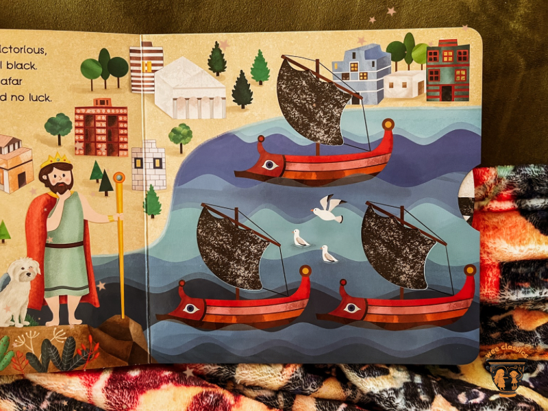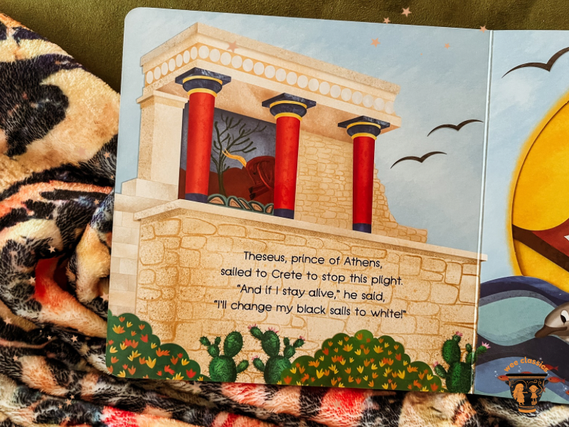 Then we meet our hero Theseus! He’s had enough of King Minos’ demands and he’s going to put a stop to it. His boat can even be moved up and down on the bumpy waves as he sails towards Crete. We loved spotting the section of the palace we’d seen ourselves in Knossos last year – such a lovely detail to add in! We find out a crucial part of the plot here too about the colour of the sails..