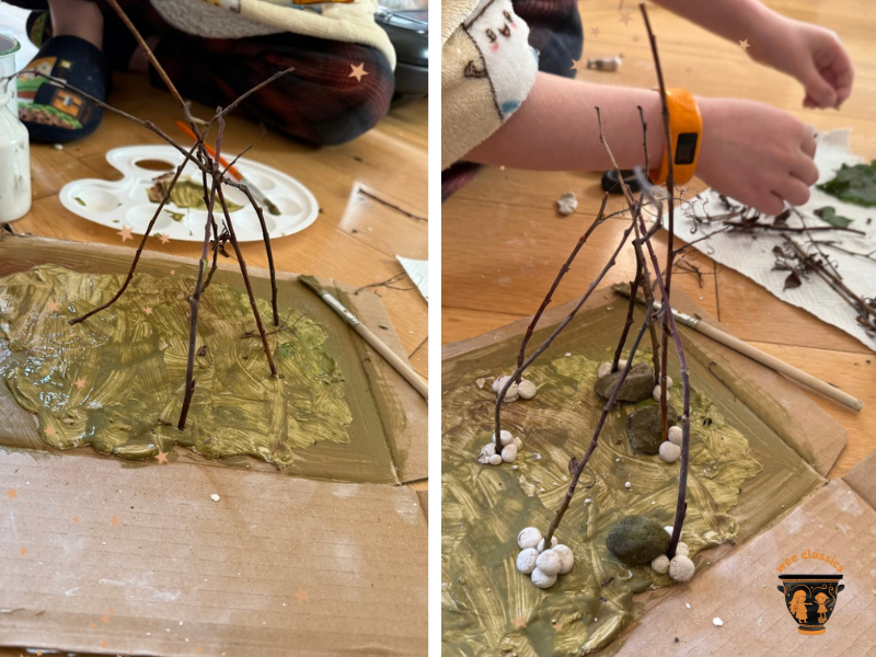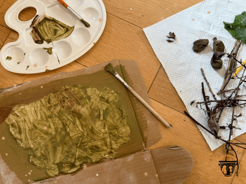 Next, you need to prepare a base for your hut to stand on. The book suggests using a wooden board, but we didn’t have any in the house so we opted for some sturdy cardboard (Amazon packaging is great!) Take another chunk of your air-dry clay and spread it out across the cardboard. It squidges quite well once it has warmed up a bit. It doesn’t matter if it is a bit bumpy and lumpy! It is meant to be the ground, after all. Once you’re happy with your ground, paint over the clay with green and brown colours. You don’t have to wait for it to dry to do this! And keeping it a bit soft makes the next step easier.