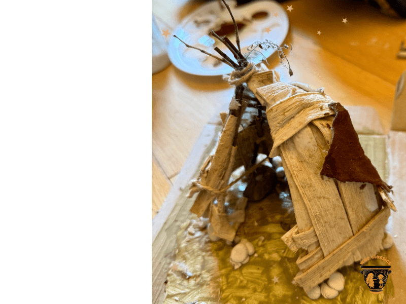 Next up we need to cover our frame with some waterproof material to keep us dry and cosy inside! The Stone Age builders would have used animal skins but we opted for some scrap materials we had around the house – papyrus strips and old fabric. But you can get inventive with this step and recycle whatever you have handy! Our fabric scraps were white so we painted them brown and speckley to make them look more like animal skins. To attach them, we brushed PVA glue all over the underside of each strip then carefully stuck it to the frame. We secured it with a bit more twine, too. This step was definitely the fiddliest. A bit of patience and some scrap engineering will get you through it though!