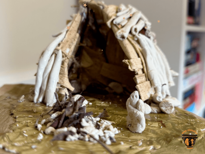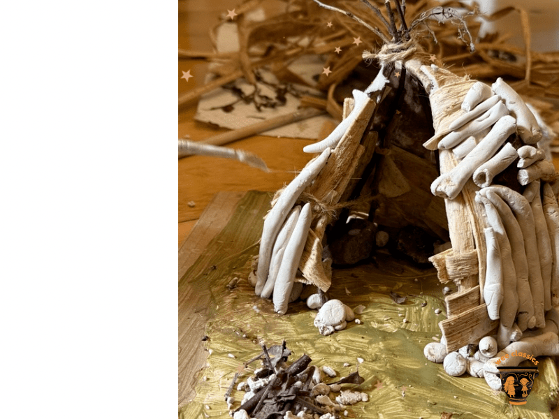 Now your cosy Stone Age hut is complete, you can add in more details. The 7yo created a little fire out of the leftover twigs and clay. He also made a tiny Stone Age man to enjoy his new shelter! We really enjoyed working on this together – and it has definitely inspired us to tackle more historic homes! Maybe something Greek or Roman next…